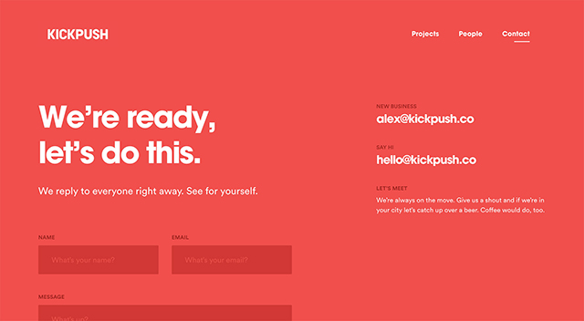 Kickpush讓他們的聯(lián)系頁面很容易找到,通過在他們的導(dǎo)航中直接顯示,而不是一些喜歡把他們的鏈接放在頁腳的網(wǎng)站。通過將他們的鏈接放置在導(dǎo)航中,并使用簡單的“接觸”字,他們就在猜測如何與他們?nèi)〉寐?lián)系。