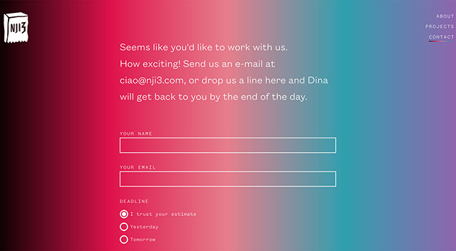 你需要努力回答所有進(jìn)入你網(wǎng)站的詢問。為了幫助你相信一個用戶的信息不會被忽視,你應(yīng)該試著寫一些積極的確認(rèn),比如NJI3的所有的女孩設(shè)計三人組都在他們的聯(lián)系方式上。他們會讓你知道,如果你給他們發(fā)信息迪娜會在一天結(jié)束之前回復(fù)你。這迫使用戶采取行動,實際填寫聯(lián)系表格。