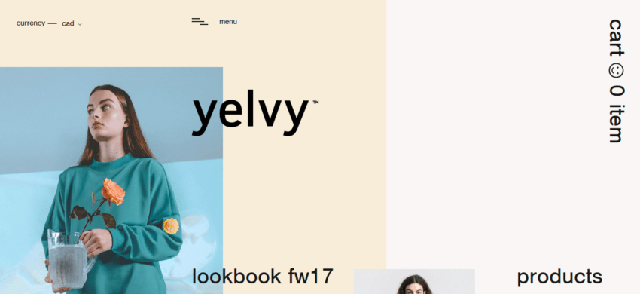 Yelvy是加拿大服飾品牌。顯然,他們的網(wǎng)站非常時(shí)尚,這并不影響其導(dǎo)航的價(jià)值。本網(wǎng)站是商品展示的輔助元素,不會(huì)分散用戶購買的注意力。