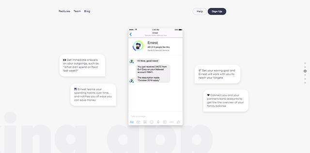 歐內(nèi)斯特的頁(yè)面風(fēng)格與我之前提到的其他登錄頁(yè)面有些不同,它使用視差滾動(dòng)動(dòng)畫(huà)在具有不同部分的頁(yè)面布局上創(chuàng)建動(dòng)作。它們根據(jù)滾動(dòng)的方向而變化,無(wú)論你向上還是向下移動(dòng),以什么速度移動(dòng)。根據(jù)頁(yè)面的不同部分,它們的強(qiáng)度也有所不同。您可以使用側(cè)邊點(diǎn)導(dǎo)航菜單進(jìn)行導(dǎo)航,這可以快速地在頁(yè)面上跳轉(zhuǎn)到不同的區(qū)域。這是你經(jīng)常在視差頁(yè)面上看到的為數(shù)不多的技術(shù)之一,它當(dāng)然有助于歐內(nèi)斯特從人群中脫穎而出。