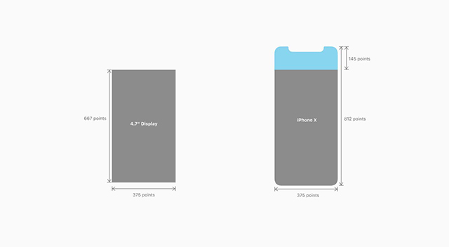 iPhone的X顯示尺寸為375pt寬度* 812 pt高。在3倍顯示中,這等于1,125 px @3倍寬度* 2,436 px @3倍高。在縱向方向上,iPhone X上顯示的寬度與iPhone 6、iPhone 7和iPhone 8的4.7英寸屏幕的寬度相匹配,因此所顯示的信息量與這些設(shè)備的窄尺寸沒有任何區(qū)別。但是顯示器有不同的高度:812pt的高度高出145pt,高達4.77t的4.7“。 這個額外的iPhone X高度為內(nèi)容提供了20%的空間。