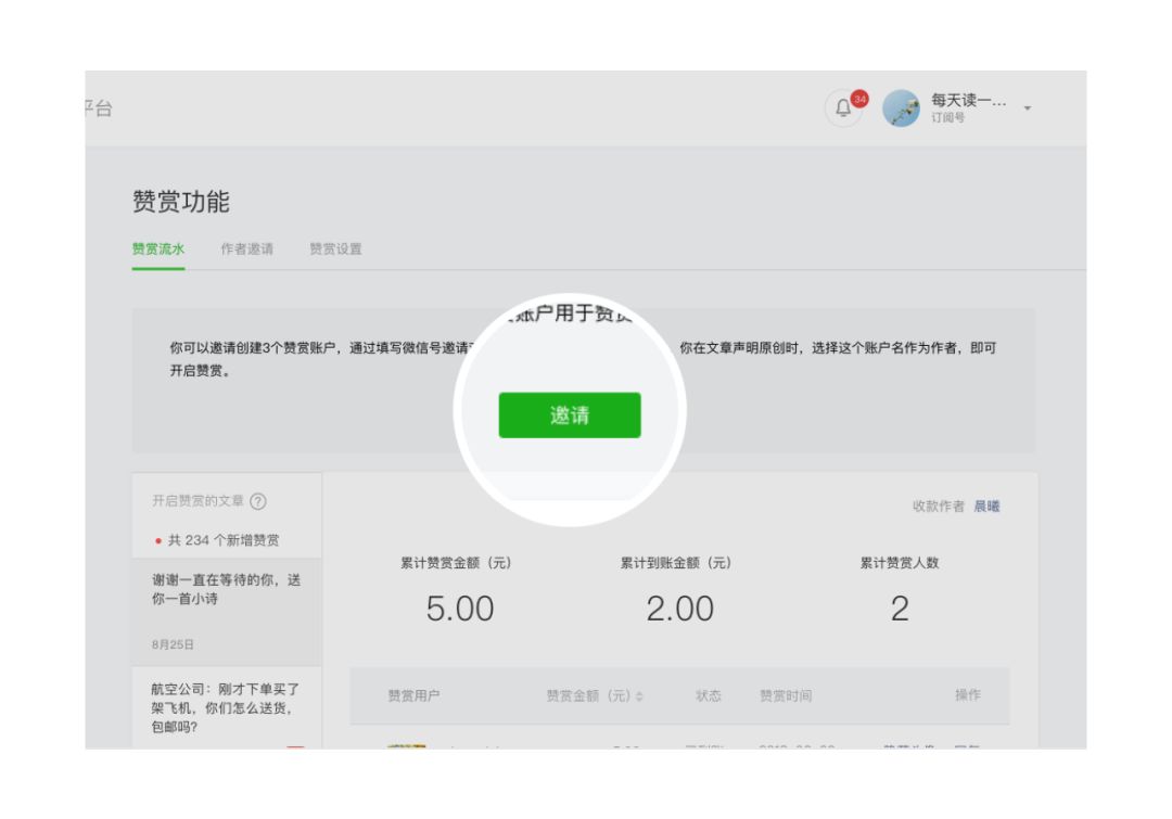 有邀請權(quán)限的公眾號在“贊賞功能”里填寫微信號發(fā)送創(chuàng)建邀請。